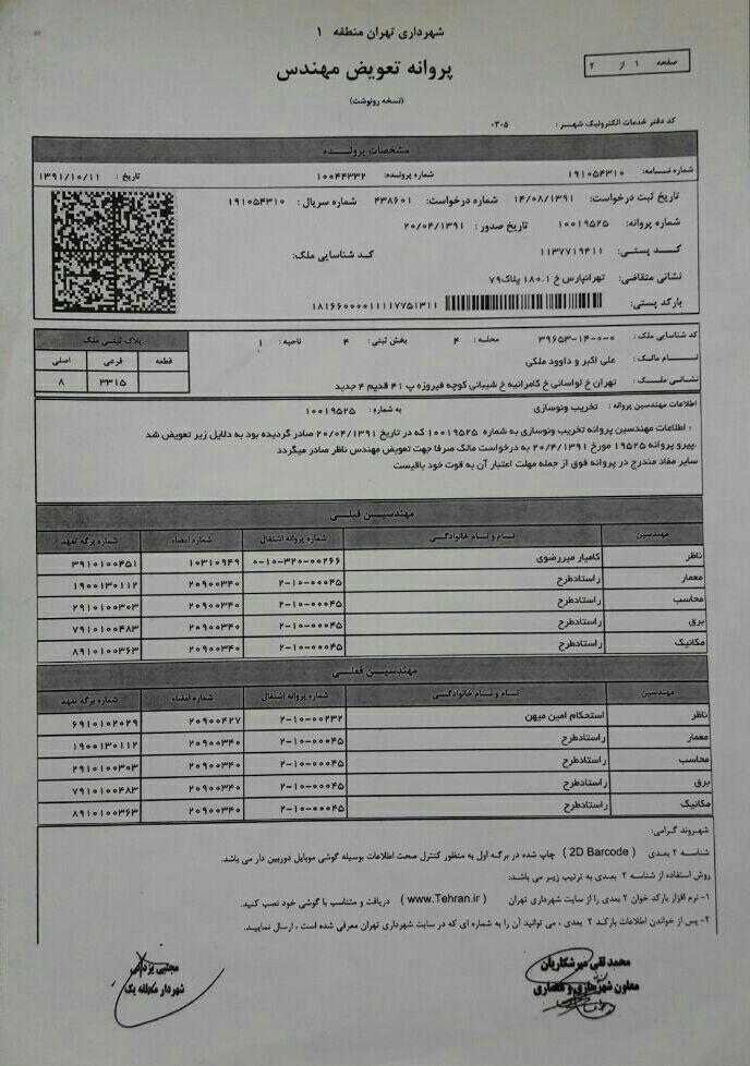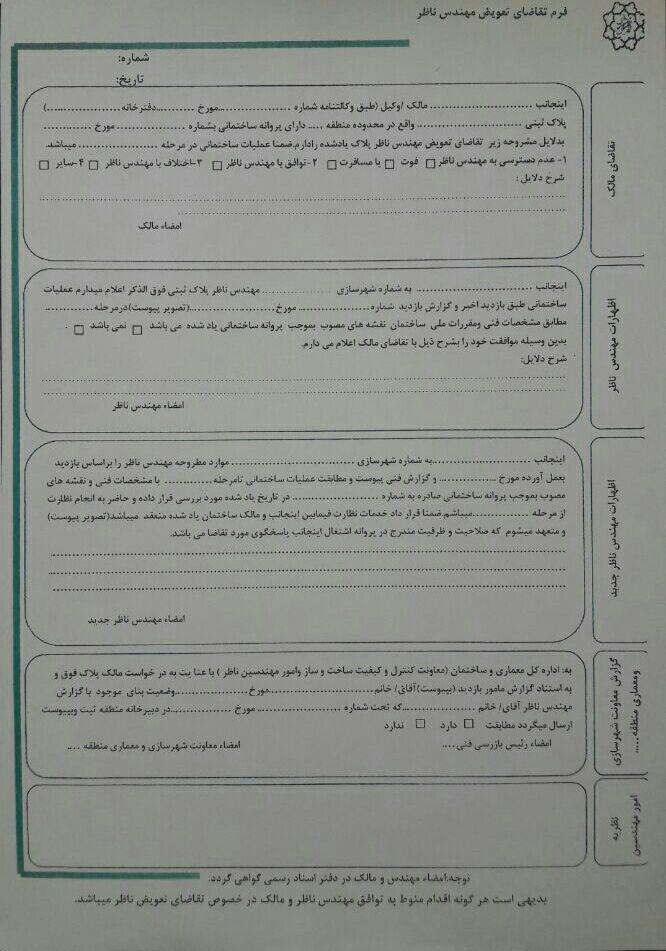 • موضوع بعدی بسیار مهم و بحث برانگیز است.فرمهای تعویض ناظر در استان تهران سه وجهی بوده و توسط شهرداری تهران تهیه و ارائه گردیده است و این فرمها باید تکمیل گردند و توسط ناظر قدیم و ناظر جدید و مالک ساختمان در دفتر خانه اسناد رسمی گواهی امضای محضری شوند و این گواهی های محضری توسط مالک به دفاتر خدمات الکترونیک  تحویل ودرخواست تعویض ناظر میشود.