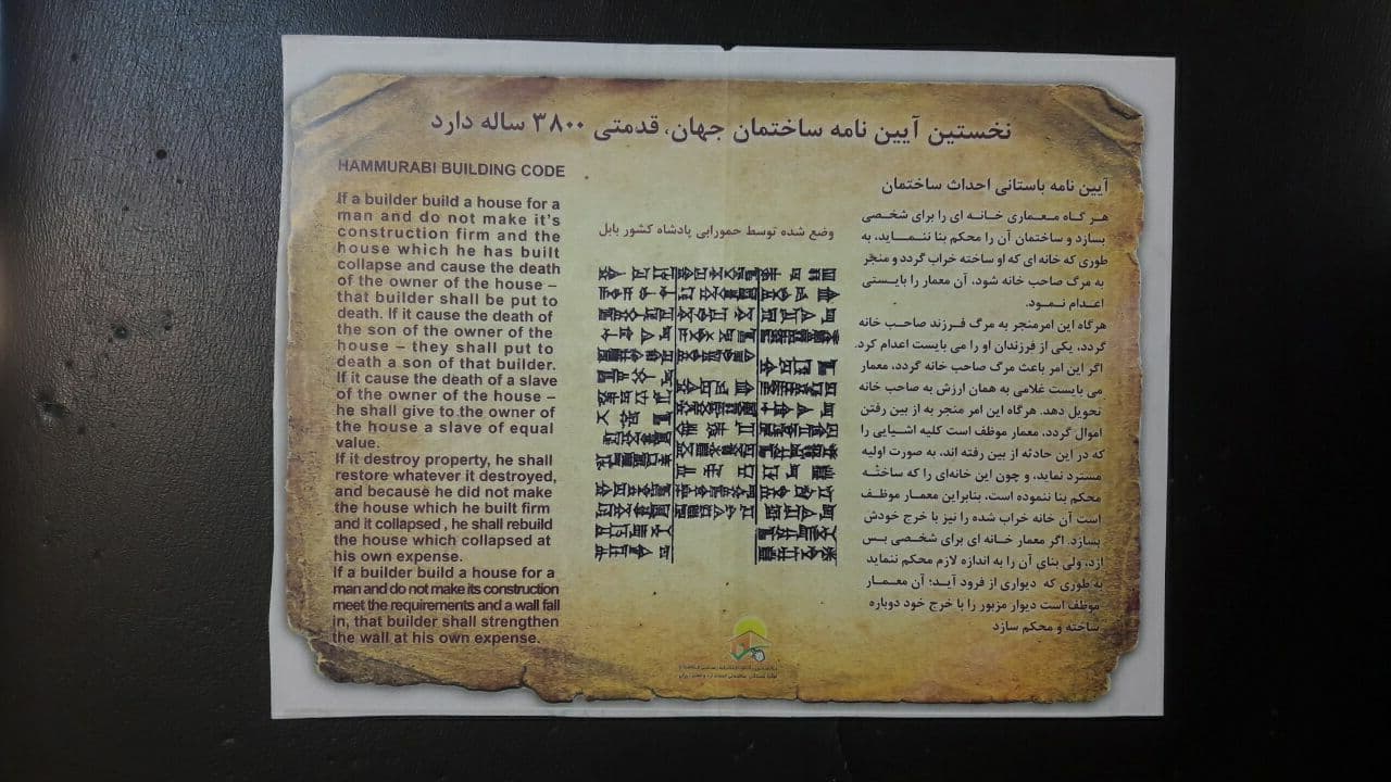 سنگ نوشته ای به خط میخی وجود داردکه توسط باستان شناسی به نام نورمن به زبان انگلیسی ترجمه و سپس به زبان فارسی برگردانده شده است که مربوط به 4000 سال پیش در زمان پادشاهی حمورابی عادل در بابل ( بغداد کنونی ) در تنها تمدن آن زمان یعنی بین النهرین (بین نیل و فرات)که اشاره کوتاهی به تعهد مهندس و معمار به نتیجه دارد .