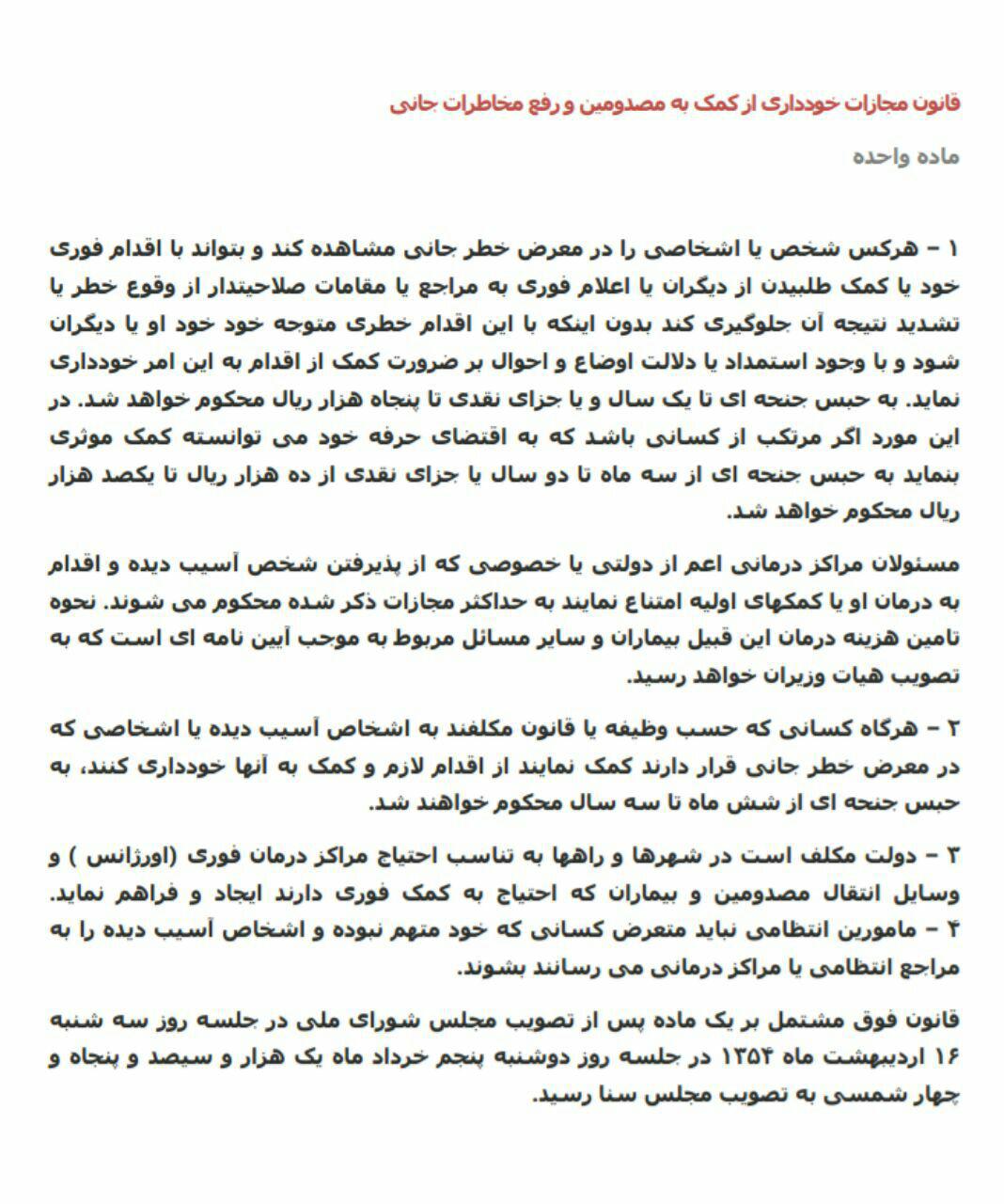 قانون مجازات خودداری از کمک به مصدومین و رفع مخاطرات جانی مصوب 5/3/1354
