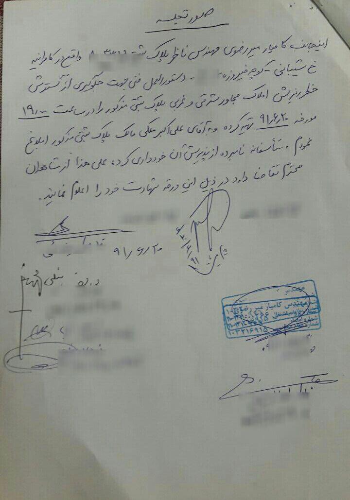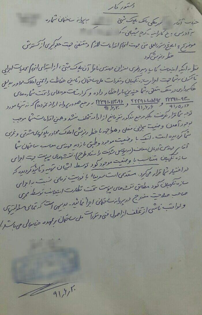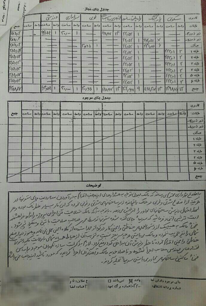 در سال 1391 برای ساختمانی در منطقه کامرانیه تهران پروانه ساختمانی صادر میشود.مهندس ناظر در زمان امضای شروع بکار دستورکاری را برای تخریب و گودبرداری تهیه نموده و به مالک ابلاغ میکند.