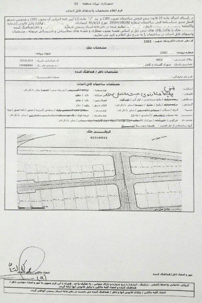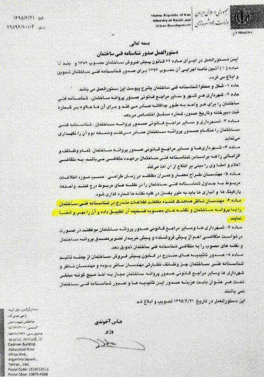 شهرداری بر اساس دستور نقشه و یک نقشه فرضی که حدود اربعه و متراژ واحدها را به صورت تقریبی در آن قید کرده است از ناظر می خواهد که آن را گواهی امضای محضری کند! اما ناظرین زیر بار نمی روند و نظام مهندسی تهران هم می گوید با توجه به ماده 6 ؛ بخشنامه ای که آقای آخوندی وزیر محترم راه و شهرسازی در شهریور 1395 صادر کرده است، ناظرین نباید این کار را بکنند؛ توصیه ما نیز این است که این فرم ها امضاء نشوند زیرا با بند 6 بخشنامه مذکور مغایرت دارد.