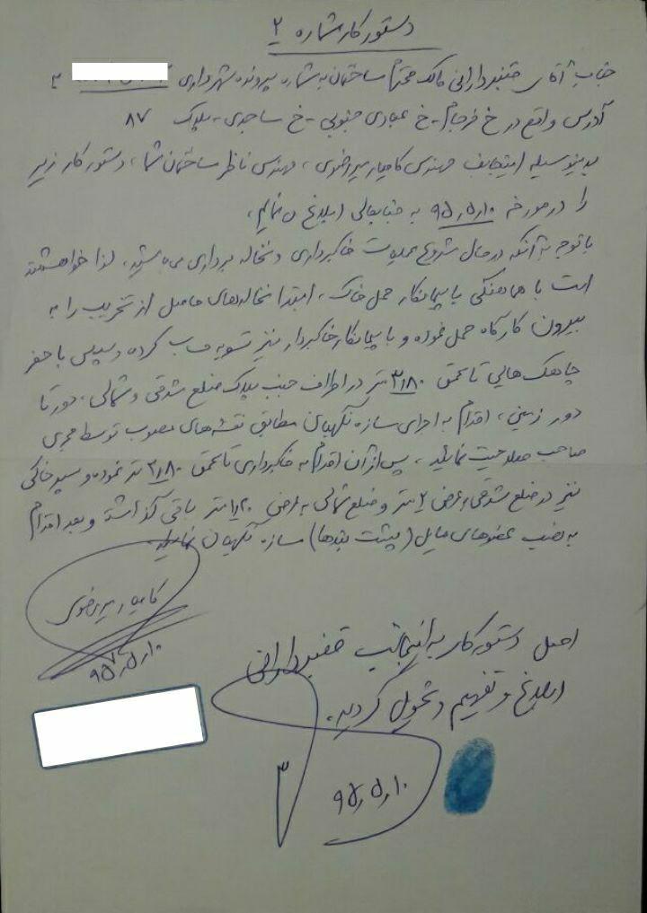پس از اینکه دستور کار به مالک ابلاغ شد یک گزارش در ابتدای شروع بکار ماشین آلات در جمع آوری نخاله ها به شهرداری داده شود با این محتوا که: “مالک اجازه خاکبرداری ندارد و فقط باید نخاله برداری کرده و سپس سازه نگهبان اجرا شود و پس از آن شروع به خاکبرداری (گودبردای) نماید.”