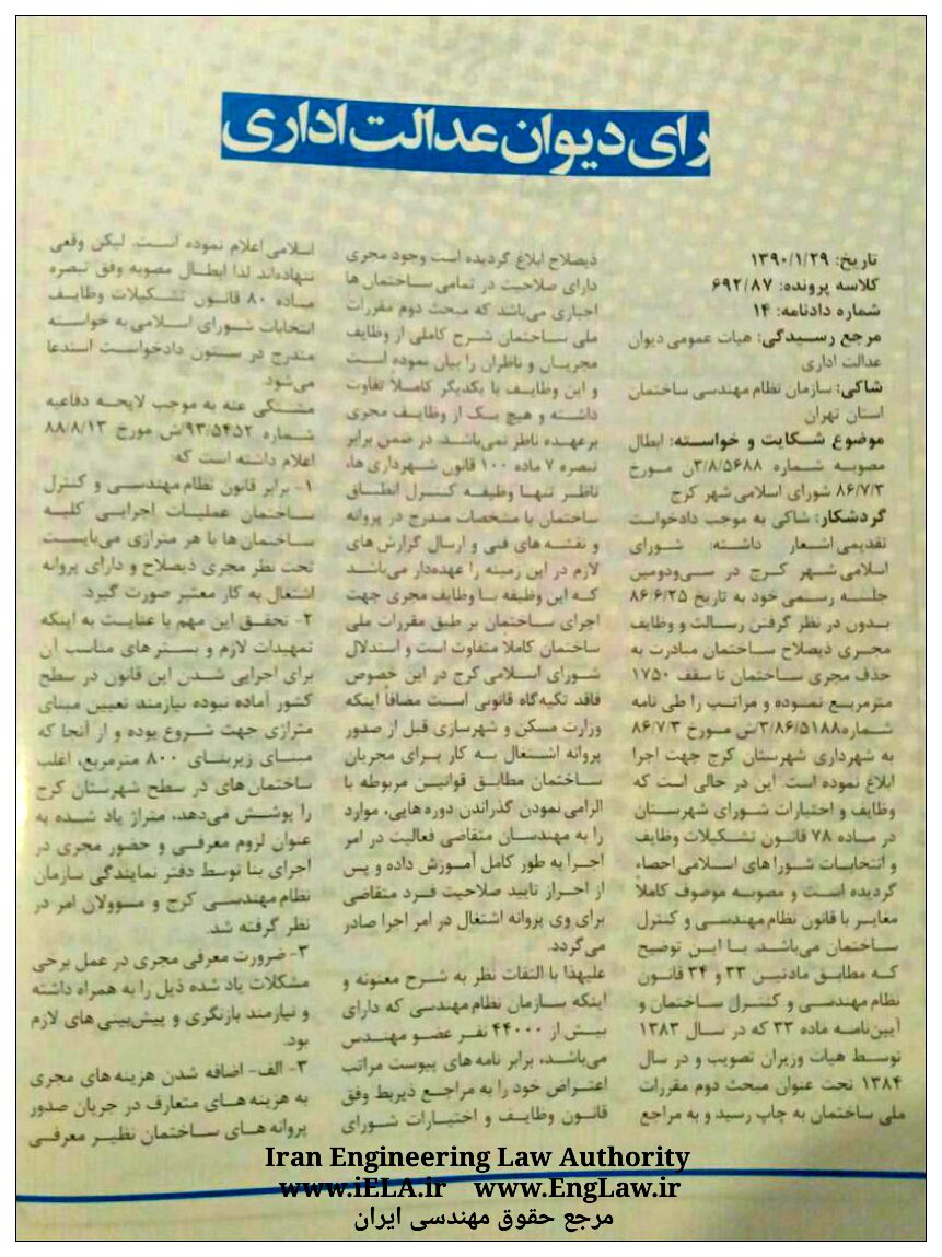 حدوداً در سال 1390 در کرج هم این رأی صادر شد و فقط برای کارهای بالای 1700 متر مربع باید مجری ذیصلاح معرفی می شد، این رأی در شورای شهر مصوب شد، اما دوستانی از نظام مهندسی بر علیه شورای شهر شکایت کردند زیرا این رأی بر خلاف مبحث دوم بود؛ و باز هم یک رأی دیگر صادر شد مبنی بر اینکه حتی برای یک متر مربع هم  می بایست شخص صاحب صلاحیت (مجری ذیصلاح) انتخاب شود. همانطور که می بینید این دو رأی کاملاً همدیگر را نقض می کنند.