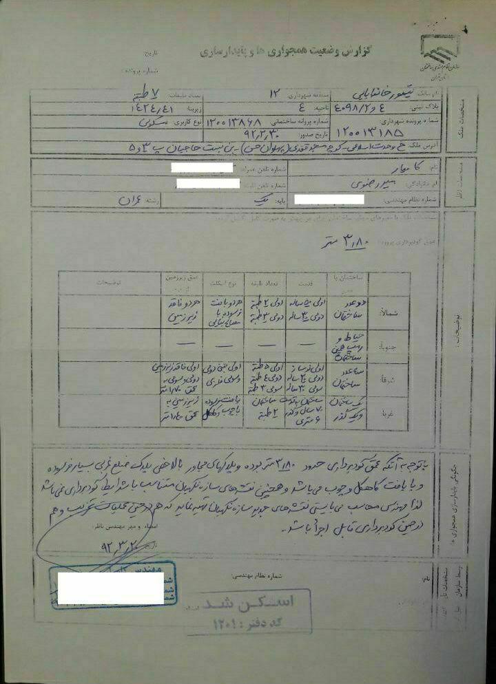 سپس ناظر میبایست نقشه های مصوب سازه نگهبان را بررسی کرده و در صورت نبود یا عدم تناسب نقشه سازه نگهبان مصوب با شرایط موجود محل، در گزارش همجواری یا گزارش تخریب این مورد را حتما ذکر کند و در ادامه به مالک دستور کاری جهت مراجعه به مهندس محاسب و درخواست نقشه سازه نگهبان مناسب با شرایط ملک، با اخذ رسید ابلاغ نماید. هم چنین لازم است با مهندس محاسب نیز جهت مراجعه حضوری به محل برای بررسی وضع موجود و طرح نقشه مناسب، طی نامه ای مکاتبه کند.